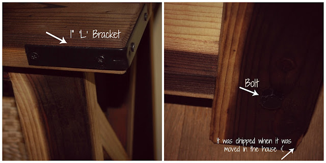 After the console was dry, we applied one layer of wood sealant, let that dry and then added the hardware. We added 3" 'L' brackets to the corners & bolts to the bottom, one on each leg. We weren't able to find black ones in the stores, so we purchased the silver ones and spray painted them using my favorite Rust-Oleum 2X Ultra Cover Black Flat.